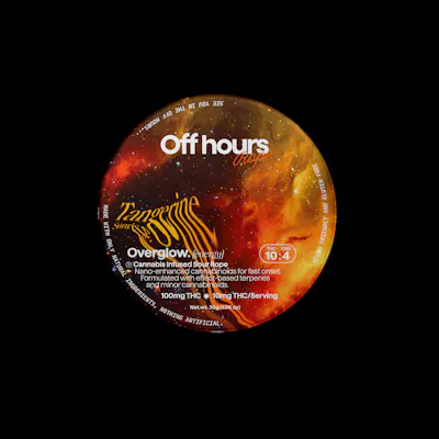 Off Hours Tangerine Sunrise Overglow ropes are the perfect pick me up throughout your day. Specially formulated with an energizing blend of THC and CBG for a happy, uplifting high. FLAVOR: Tangerine Sunrise (sour) SIZE: 1ct STRENGTH: 100mg THC (10mg/serving) | 40mg CBG (4mg/serving) Effect: Energy SUGGESTED USE: Start with 1/2 of a section. Wait 1 full hour before increasing dose. INGREDIENTS: Organic Cane Sugar, Reverse Osmosis Water, Organic Tapioca Syrup, Organic Fruit Juice From Concentrate, Fruit Pectin, Organic Fruit Flavoring, Natural Food Coloring, MCT Oil, Cannabis Extract, Soy Extract, Malic Acid, Terpenes