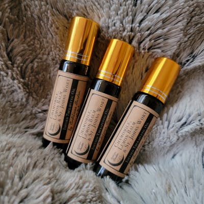 Crafted with consideration and comfort in mind | Ingredients: Golden Jojoba and Sweet Almond Oils solar infused with St. Johns Wort, Chamomile, and Lemon Balm | Easy Roller Application | Use for topical concerns as needed |