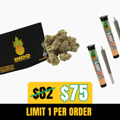 Bundle includes • 14g Hybrid Pruno (Indoor Smalls Black Label) - Humble Root • TWO x 1g Hybrid Pineapple Salad Pre-Roll - Humble Root