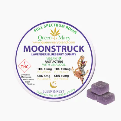 Find your calm with Queen Mary Moonstruck gummies. These fast-acting, vegan gummies have a soothing lavender blueberry flavor and are formulated with a 2:1 ratio of rosin to CBN (10mg:5mg per gummy) for a total of 100mg of THC + 50mg of CBN per pack. With CBN for its pain-relieving and anti-inflammatory properties, and linalool (a terpene found in lavender) for its calming and sedative effects, this blend is designed to help you relax and unwind.