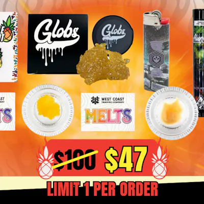 Pre-order early to lock in the earliest delivery times. Delivers starting on 4/17. Bundle includes • 1g Hybrid Modified Honey Sauce - Globs • 1g Indica MK Ultra Badder - West Coast Trading Co. • 1g Indica Triangle Kush Sugar - West Coast Trading Co. • 1g Sativa Mango Gold x Super Silver Haze Infused Pre-Roll - Joost • 1g Hybrid Planetary OG (Indoor) Pre-Roll - Alien Labs • 1g Indica Oak-Lato Indoor Pre-Roll - Oakfruitland • Humble Root Drippy Pineapple Pin • Alien Labs Lighter