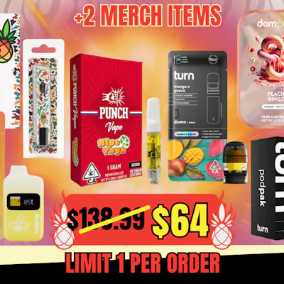 Pre-order early to lock in the earliest delivery times. Delivers starting on 4/17. Bundle includes • 1g Hybrid Ripe Yaya (510 Thread) - Punch Extracts • 1g Hybrid Peach Ringz (510 Thread) - DomPen • 1g Hybrid Pina Colada (Ready-to-Use) - Buddies • 1g Indica Mango Guava Turn Down Pod - Turn • Turn PodPak Vape Battery (Black) • Humble Root Digital 510 Battery • Humble Root Drippy Pineapple Pin • Turn Jet Tag (Assorted Color) • Turn Sticker (Assorted Color)