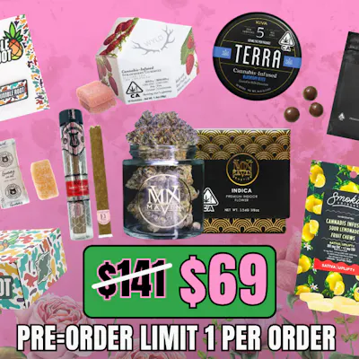 An early delivery treat for your mom! Pre-order this month’s box and get it on May 1st. May Buyer's Box includes • 3.5g Indica Umami Butter (Indoor Smalls) - Maven • 1g Indica 98k (Exotic Indoor) - Maven • 110mg 10:1 Sativa Citrus Burst Gummy (100mg THC, 10mg CBD - Per Pack) - Emerald Sky • 100mg THC Sativa Sour Lemonade Fruit Chews (10mg - 10 pack) - Smokiez • 100mg THC Hybrid Milk Chocolate Blueberries Terra Bites (5mg THC - 20 pack) - Kiva • 210mg 20:1 CBD Hybrid Strawberry Gummies (20mg CBD, 1mg THC - 10 pack) - WYLD • 1.65g Hybrid Rojo Hash Infused Especial Rose Gold Blunt - El Blunto • Humble Root Camo Pin • Humble Root Brand Box