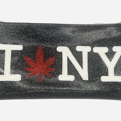 Spark up some sparkle! Inspired by the iconic city where these clutches are made, you can show your love for both your location and cannabis at the same time! Black glitter vinyl bag with glitter canvas appliqués for a super sparkly storage bag that shows off what you love and where you love it! This classic clutch is perfect as a wristlet or as a super cute stash bag! 11x5.5"! 11" XOXO brass zipper! Designed in collaboration with Kush Kards! Materials: Glitter-infused vinyl is easy to sanitize and disinfect! Designed & handmade in Brooklyn, NY!