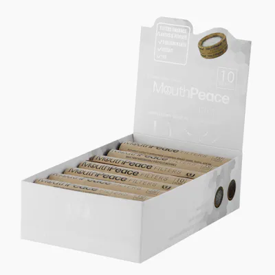 MouthPeace Filters have helped people consume more cleanly since 2019. By utilizing activated carbon’s antibacterial properties to absorb resins, contaminants, and tar, MouthPeace Filters remove the harsh stuff and enhance the flavor of your smoke or vape. Our Filters are triple layered to remove larger particles while allowing smaller molecules to pass through, all without reducing airflow or blocking your intake. Retail Unit: One (1) Display. Each display contains 15 filter rolls and each roll contains 10 filters. Removes resins, toxins, and tars