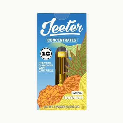 Hawaiian Sativa by Jeeter is an energizing 1 gram Liquid Diamond vape that elevates your sesh to new heights. This vibrant strain is known for its uplifting effects, enhancing both mood and mental clarity, while providing a burst of energy that keeps you buzzing throughout the day. With a tantalizing flavor profile featuring tropical pineapple notes balanced by bright lemon undertones, this cartridge is a must-have for those seeking a fruity twist. Perfect for daytime use and ideal for both seasoned enthusiasts and casual users, Hawaiian Sativa is designed to keep you active, social, and in great spirits all day long.