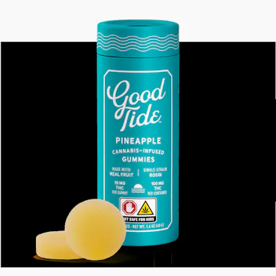 eel the sand between your toes as you bite into a Good Tide pineapple gummy. Infused with the properties of sativa-dominant strains, these pineapple gummies produce an uplifting experience that begins with true tropical fruit flavor. The naturally occurring terpenes and minor cannabinoids present in our solventless hash rosin complement the real-fruit pineapple ingredients to form a perfect pairing.