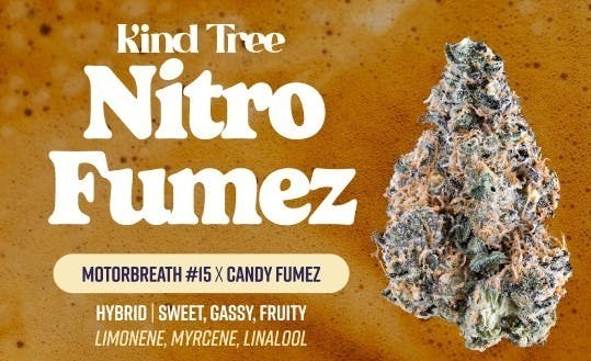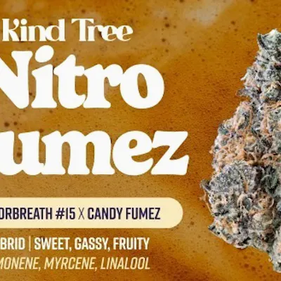 Kind Tree's Nitro Fumez is a balanced hybrid strain created by crossing Motorbreath 15 x Candy Fumez. Known for a gassy, sweet, and candy-coated aroma, it features diesel and dessert flavors. This strain is popular for inducing a balanced, relaxing high, often testing at high THC levels, such as 23-26%. Key Details for Kind Tree Nitro Fumez: Genetics: Motorbreath x Candy Fumez. Type: Balanced Hybrid. Aroma/Flavor: Fuel, Diesel, Sweet, Candy. Top Terpenes: Often includes Limonene, Beta-Myrcene, and Linalool. Effects: Relaxing, uplifting, and happy. Common Use: Stress relief and relaxation