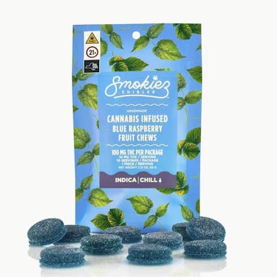 Enhanced with real cannabis terpenes! Smokiez Sour Blue Raspberry Indica Fruit Chews are NOT YOUR AVERAGE FRUIT CHEWS™ ;) These fruit chews taste like fresh raspberries, but with a zing! They have a tangy taste that is reminiscent of ripe berries. These delicious fruit chews are a tasty and discreet way for you to medicate! They are also Vegan, Gluten Free, Dairy-Free, and contain NO High Fructose Corn Syrup. Each of our mouth watering fruit chews contain 10 mg of THC, and made with our high clarity cannabis distillate for great taste. There are 10 pieces per package with 100 mg active THC per package.