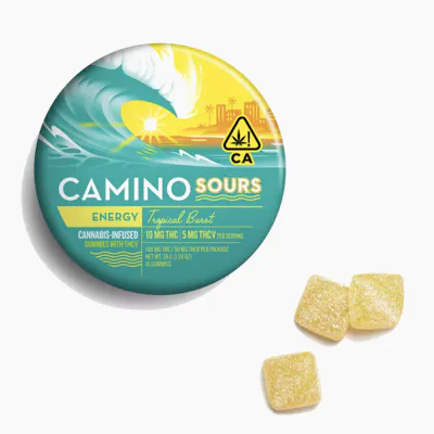 Have you ever dealt with a demanding schedule, approaching deadlines, and a sense of fatigue creeping in? This is precisely when Camino Sours Tropical Burst Energy gummies step in to give you just the boost you need. Packed with 10MG of THC and 5MG of THCV with sativa-like terpenes and the vitamins B6 and B12 combined with the perfect amount of caffeine, these gummies are your ticket to an enlivened experience. THCV is your energy-boosting ally, potentially enhancing metabolism and curbing appetite. It ensures a clear-headed journey ahead. Vitamin B6 is a prominent player in the body’s energy-production process to give your body the fuel it needs for physical activity. Vitamin B12 helps keep your body’s blood and nerve cells happy. Caffeine, the world’s most popular stimulant, is renowned for its mood-enhancing properties. We add just enough to support increased alertness and a reduction in fatigue, providing a pep in your step equivalent to half a cup of iced tea. Whether you're about to embark on a thrilling adventure, or simply need a boost to seize the day, Tropical Burst Energy Camino Sours are your go-to choice for an invigorating experience that propels you forward with newfound vitality. Terpenes: Alpha-Pinene, Beta-caryophyllene, Limonene, Valencene