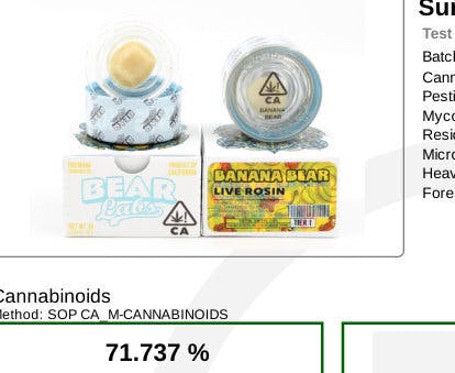 Banana Bear combines the delightful allure of ripe bananas with the earthy undertones synonymous with your favorite cannabis concentrates. Hailing from sunny southern California, this unique strain captures attention with its remarkable fruit-forward appeal that, just like the first bite into a fresh banana, bursts forth right from the moment you open the package. Its smooth, well-rounded flavor profile makes Banana Bear a must-have for cannabis enthusiasts, akin to the joy of sinking your teeth into a ripe, juicy apple or succulent vine-ripened tomato.