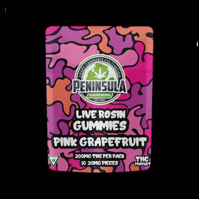 Peninsula Garden Live Rosin Gummies Pink Grapefruit 200mg are a flavorful hybrid edible crafted for a well-balanced experience. These gummies feature a terpene profile rich in limonene, caryophyllene, and myrcene, delivering bright citrus notes with subtle earthy undertones. Designed for both daytime and evening use, they offer euphoric, mood-lifting effects ideal for stress relief, mild relaxation, or enhancing social moments. While the exact lineage isn’t specified, the hybrid blend in these live rosin gummies makes them a versatile and flavorful option for users seeking a balanced, functional high.