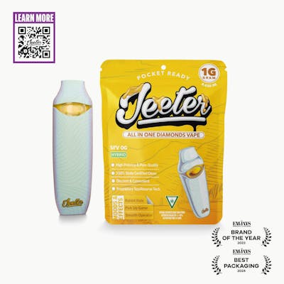 The Jeeter Liquid Diamond Disposable Indica SFV OG (1g) delivers a powerful and flavorful vaping experience crafted from the classic San Fernando Valley OG Kush lineage. Known for its pungent aroma and earthy pine, citrus, and diesel notes, SFV OG offers smooth, terpene-rich vapor thanks to Jeeter’s high-potency liquid diamond extraction. With a terpene profile dominated by Myrcene, Caryophyllene, and Limonene, this Indica provides deep body relaxation, stress relief, and a calming mental buzz. Ideal for evening or nighttime use, this 1g disposable is perfect for unwinding, easing tension, and promoting restful sleep.