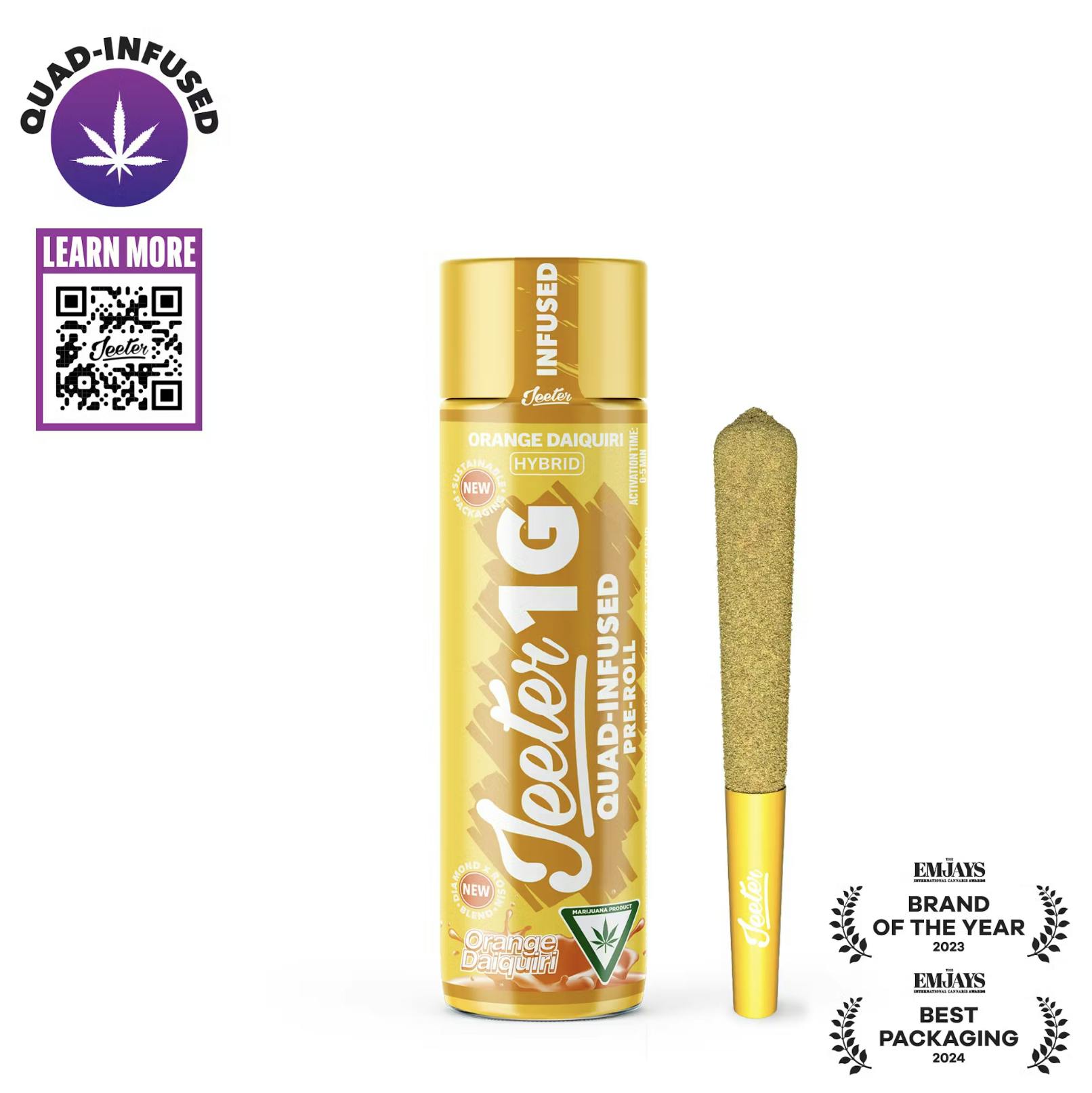 Orange Daiquiri - HybridOrange Daiquiri is an evenly balanced hybrid strain with a bright, tropical citrus terpene profile that stems from mysterious genetics. True to its name, the inhale provides a medley of tropical citrus fruit notes with a crisp orange overtone that is as refreshing as it is delicious. You can almost feel the bubbles on your tongue before the exhale reveals a surprising earthy undertone of pine and spice, adding to this unique strain's complex flavor. The perfect early afternoon toke, Orange Daiquiri will leave you feeling relaxed.Jeeter’s Quad Infused Prerolls combine four layers working in sync for a maxed out infused experience. THCA diamonds add potency, rosin brings smooth, full spectrum depth, expertly crafted terpene profiles help shape the entourage effect while enhancing aroma, and a kief finish adds strength with a hand crafted touch. The result is a harder hitting experience with richer flavor that lasts longer.* Infused w/ liquid diamonds and rosin, dusted in kief* 5 x 0.5G Quad-Infused Minis totaling 2.5 Grams