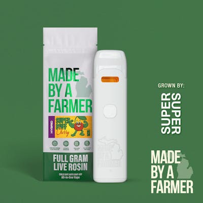 Made By A Farmer Live Rosin Disposable Indica –Super Buff Cherry 1g is a solventless live rosin vape featuring the popular Super Buff Cherry hybrid lineage, known for its rich cherry-forward aroma with sweet, tropical fruit and earthy undertones that carry through to the vapor. Super Buff Cherry blends genetics from Super Boof and Tropicana Cherry, offering a flavorful experience with bold fruity and cherry notes.