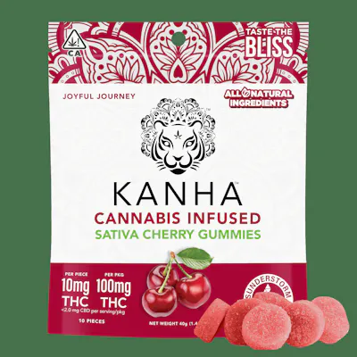 10 pieces x 10mg/gummy = 100mg/bag Kanha gummies are made with all-natural ingredients, coloring, and flavoring. Each gummy is infused with the highest quality cannabis oils to provide the most consistent, safe experience on the market. Our Cherry gummies are juicy sweet and made with sativa terpenes, which induce a stimulating and uplifting state of mind.