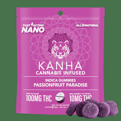 20 pieces x 5mg/gummy = 100mg/bag Kanha Nano utilizes nanomolecular technology to create the first fast-acting gummies in the industry. We take our award-winning, great-tasting gummies and infuse them with cannabinoid particles smaller than a wavelength of light, which increases the speed and amount that enters into your bloodstream. Our Passionfruit Paradise gummies are divinely sweet and made with indica terpenes, which induce a calm and relaxed state of mind. And with only 5mg of THC per gummy and an average of 10-20 minutes for onset, these are the perfect gummy for micro-dosing.