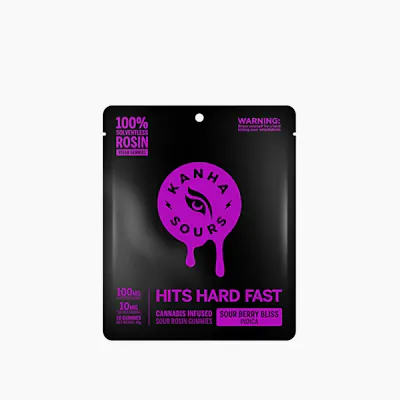 KANHA Indica Sour Berry Bliss Rosin Sours 10 pieces x 10mg/gummy = 100mg/bag Berry sourness that chills you out. Sour Berry Bliss vegan gummies contain 10mg of fast-acting THC per piece, featuring solventless rosin from an indica strain. With 100mg of THC per pack, these gummies will smack you into chill mode. Solventless Rosin Vegan Fast-Acting NANO Strain-specific Hits like flower Instructions: Eat 1 gummy. Onset starts around 5-15 minutes. Wait 60 minutes for full effect. Keep in a cool, dry place. Avoid temperatures over 75°F. Ingredients: Vegan Sugar, Tapioca Syrup, Water, Malic Acid, Pectin, Citric Acid, Natural Flavor, Tartaric Acid, Sodium Citrate, Natural Fruit Concentrate, Solventless Rosin Cannabis Extract, VESIsorb Nanotechnology, Natural Color