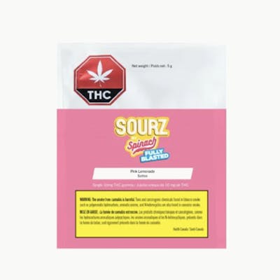 SOURZ by Spinach Fully Blasted Pink Lemonade Gummies are packed with 10mg THC per piece. Send your taste buds soaring with the sweet and refreshing flavours of raspberry and lemonade. This dual-flavoured gummy is over-the-top with natural flavours and blasted with sour crystals. Enjoy one gummy per pack, 10 mg THC total.