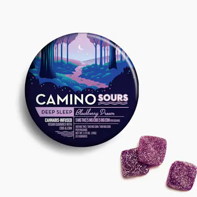 5mg THC: 5mg CBD: 5mg CBN per piece | 100mg THC: 100mg CBD: 100mg CBN total in 20 pieces Drift into dreamland by way of a whimsical woodland forest filled with fragrant blackberry bushes. Blackberry Dream Camino Sours combine THC, CBD, and CBN with chamomile and lavender extracts for a tranquil effect enhanced by soothing, indica-like terpenes. Take one of these subtly sour gummies and call it a night. INGREDIENTS: Tapioca Syrup, Sugar, Water, Pectin, Natural Flavors, Malic Acid, Citric Acid, Sodium Citrate, Sodium Malate, Chamomile Extract, Lavender Extract, Cannabis Extract, CBN Isolate, Fruit & Vegetable Juice for Color, Coconut Oil, Carnauba Wax, Terpenes.