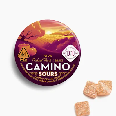 10mg THC & 10mg CBD per piece | 100mg THC & 100mg CBD total in 10 pieces Come back to center as the vivid rays of twilight hour sweep across rolling orchard hills. Orchard Peach Camino Sours are characterized by tart notes of lush, ripe peach with a balancing blend of CBD and THC with indica and sativa-like terpenes. INGREDIENTS: Tapioca Syrup, Sugar, Water, Pectin, Natural Flavor, Citric Acid, Malic Acid, Sodium Citrate, Sodium Malate, Cannabis Extract, Fruit & Vegetable Juice for Color, Coconut Oil, Carnauba Wax, Terpenes.