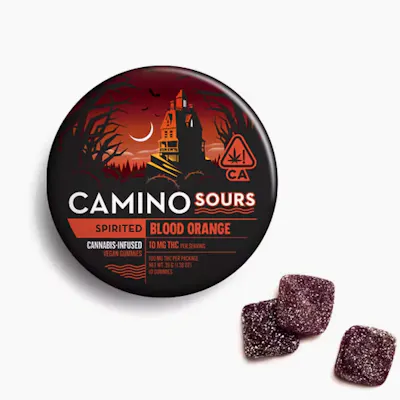 10mg THC per piece | 100mg THC total in 10 pieces Shriek not in terror, but in delight- for this Halloween, Camino Sours Blood Orange gummies now feature a new “Spirited” effect, 10MG THC, and a vegan recipe with a supernatural dusting of sour sugar. With a stimulating blend of sativa-like terpenes and the intense, sweet flavor of blood orange, thrill-seekers should move quickly before they vanish into the night... INGREDIENTS: Organic Tapioca Syrup, Sugar, Gelatin, Malic Acid, Natural Flavors, Citric Acid, Cannabis Extract, Fruit and Vegetable Juice for Color, Natural Terpenes, Coconut Oil, Carnauba Wax