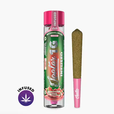 Watermelon ZKZ Jeeter Infused Rolled Joint: 1g Joint | Indica | 35.87% THC Indoor Grown Infused with Distillate Oil & Kief Watermelon ZKZ is the indica-dominant cross of the hugely popular Zkittlez and Watermelon. It offers a wonderful fruity aroma and flavor profile that is mouthwateringly scrumptious. It's high may set in quickly, delivering a powerful, head-rushing euphoria. With its heavy effects, Watermelon ZKZ is best reserved for the end of the day. Flavors Sweet Tropical Earthy