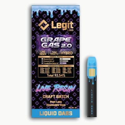 Discover Legit Labs premium Live Resin Disposable Vapes, expertly crafted with terpene-rich, dab-grade concentrate. Each puff delivers a powerful, full-spectrum experience, ensuring maximum potency and purity. With strain-specific flavor profiles, these vapes hit hard, providing a smooth yet intense draw that highlights the natural flavors and effects of your favorite strains. Perfect for those seeking a convenient, robust, and flavorful vaping experience. *Free of botanical terpenes and any other additives! *LIVE RESIN with 7.48% Terpenes! Based on breeder and cultivator, the "Grape Gas 2.0" strain is a variation of the Grape Gas hybrid, which has different genetic lineages depending on the version. In general, the strain is known for its high potency, balanced effects, and complex flavor profile that blends sweet grape and gassy diesel notes. Genetics Different versions of Grape Gas exist depending on the breeder, leading to varied genetics. True Canna Genetics: This version is an evenly balanced hybrid of Purple Halitosis #4 and a strain called The Truth. Compound Genetics: Their variation is an indica-dominant hybrid bred by crossing Grape Pie and Jet Fuel Gelato. Blimburn Seeds: This version is a cross between Grape Gas and Kosher, resulting in an indica-dominant (60%) plant. Effects The effects of Grape Gas are typically balanced, offering both cerebral and physical sensations. The high often begins with an uplifting, euphoric mental rush that enhances mood and creativity. This is followed by a relaxing and calming body melt that can help release tension and stress. The balanced high makes it suitable for both daytime and evening use, with some variations leaning more towards sedation. Flavor and aroma As its name suggests, Grape Gas is known for a distinctive combination of fruity and pungent notes. Flavor: The flavor is a mix of sweet grape and berry with spicy citrus notes and a heavy, gassy diesel undertone. Some users describe hints of fruit candy. Aroma: The scent is primarily gassy diesel and sour grape, with earthy and herbal accents.
