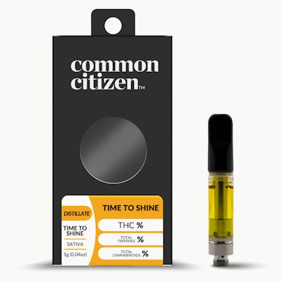 "Broad Spectrum Distillate Cartridges are a pure and potent way to consume cannabis. The cartridges use only cannabis terpenes which are single-sourced from our state-of-the-art hybrid greenhouse. Each strain's terpene profile is precisely represented in these true-to-plant cartridges. Orange Wedding Cake, a delightful sativa strain, induces a euphoric, energetic, and uplifted state with a touch of happiness. Its flavor profile boasts notes of orange, sweet vanilla, earthy undertones, and a hint of citrus, offering a sensory experience that mirrors its uplifting effects. Perfect for those seeking a burst of positivity and a flavorful journey. --- Common State: Time to Shine Feelings: Happy, Uplifted, Euphoric, Energetic Aroma: Orange, Sweet, Vanilla --- Species: Sativa Lineage: Orange Push Pop x Wedding Cake May relieve: Depression, Stress, Anxiety Flavor: Citrus, Earthy, Sweet --- Time to Shine Elevate the every day from time-to- time with Time to Shine. Experience events and adventures that are richer, fuller, and more vibrant. Turn up the fun, tune in to deeper levels of connection, and explore new dimensions of familiar activities." -Common Citizen