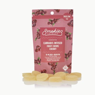 Smokiez™ Cherry 2:1 THCV Fruit Chews are NOT YOUR AVERAGE FRUIT CHEWS™ . These delicious fruit chews are a tasty and satisfying way for your customers to medicate! They are also Vegan, Gluten Free, Dairy-Free, and contain NO High Fructose Corn Syrup. Each of our mouth watering fruit chews contain 5mg of THCV and 10mg of THC. Made with our high clarity cannabis distillate for great taste! There are 10 pieces per package with a total of 50mg active THCV and 100mg of THC. Great for energy, focus & stamina.