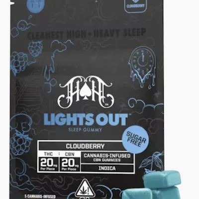 Cloudberry Sugar Free Lights Out 100mg THC/ 100mg CBN. A PREMIUM SUGAR FREE NIGHTTIME GUMMY CRAFTED TO DELIVER THE SAME RESTFUL AND RELIABLE EXPERIENCE AS OUR BEST SELLING LIGHTS OUT LINE NOW MADE WITH NATURAL SUGAR FREE SWEETENERS. POTENCY AND RATIO: 1:1 THC TO CBN 20 MG THC AND 20 MG CBN PER GUMMY ONLY 5 CALORIES PER SERVING FLAVOR PROFILE: A LUSH CLOUDBERRY TASTE THAT BLENDS GOLDEN BERRY SWEETNESS WITH A PUNCH OF CITRUS. BOLD JAMMY AND FULL OF CHARACTER.