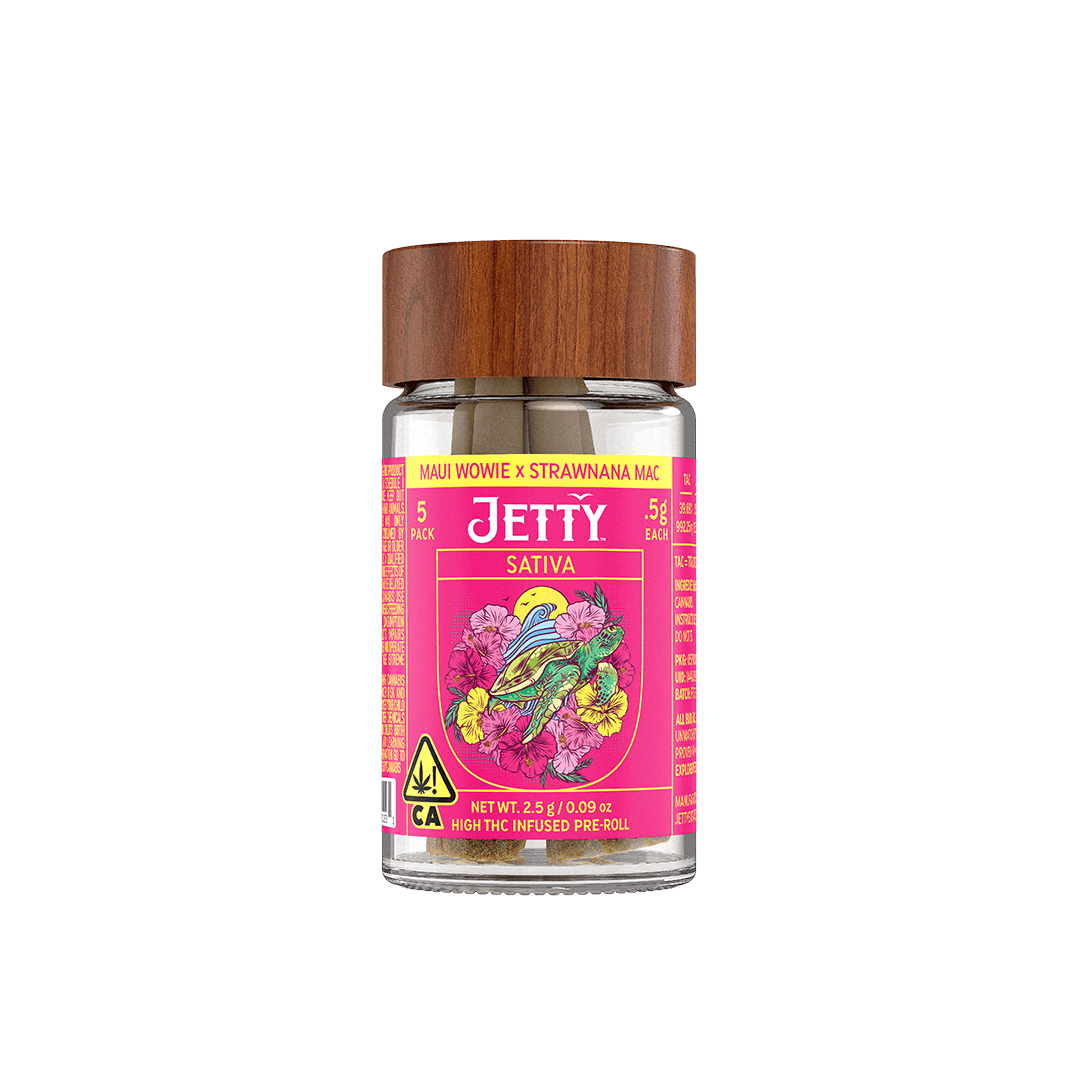 Maui Wowie keeps you moving while Strawnana Mac brings creamy, fruity depth—the result is a flavorful preroll that feels like vacation in motion. Infused with Jetty High THC. Classic strains you know and love. High potency oil paired with premium small buds. Cryoinfused to preserve more terpenes, cannabinoids, and other natural plant compounds, giving you amazing flavor and a smooth smoke from start to finish. Top-shelf bud. Curated flower and oil pairings. Supercharged Potency. Find your flavor with Jetty Pre-Rolls.