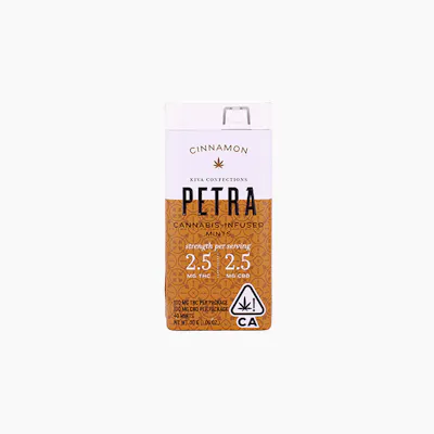 Petra was California's first microdosed cannabis infused mint. It boasts the most discreet, portable, pocketable, and purse-able edibles package on the market. Now these delicious cinnamon mints feature a 1:1 ratio with 2.5MG CBD and 2.5MG THC per mint. Petra is perfect for the new or casual cannabis user, and the seasoned cannabis user looking for a consistent, low dose of THC throughout the day. All Petra flavors are sugar free, vegan, and contain the natural, plant-derived sweetener xylitol. Ingredients: Xylitol, Saigon Cinnamon, Dextrin, Natural Flavors, Rebiana (Stevia), Fruit & Vegetable Juice for Color, Cannabis Extract, Magnesium Stearate, Silicon Dioxide.