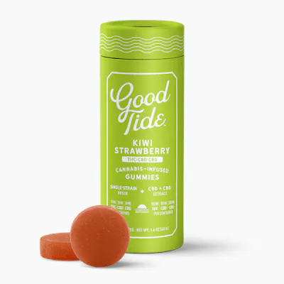 Lean into relaxation and recovery with Good Tide Kiwi Strawberry THC:CBD:CBG gummies. Hybrid single-strain rosin along with an extra boost of CBG are wrapped up with juicy kiwi strawberry flavors to help you fully unwind. 10mg THC:10mg CBD:10mg CBG per gummy" "Ingredients: Sugar, Tapioca Syrup, Water, Kiwi Juice Concentrate, Strawberry Juice Concentrate, Pectin (Pectin, Sodium Citrate), Natural Flavoring, Coconut Oil, Malic Acid, Hemp Extract, Citric Acid, Cannabis Extract, Fruit and Vegetable Juice (Color), Sunflower Lecithin Contains: Coconut"