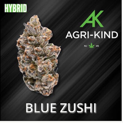 Blue Zushi is a slightly indica dominant hybrid strain (60% indica/40% sativa) created through crossing the delicious Zkittlez X Kush Mints strains. Known for its gorgeous appearance and pretty well balanced high, Blue Zushi is perfect for any indica lover. This bud has small and fluffy rounded forest green nugs with deep blue undertones, vivid orange hairs and a thick frosty coating of gorgeous tiny blue-tinted white crystal trichomes. As you pull apart each sparkling little nugget, aromas of spicy flowers and rich earthy pine are released, almost like walking through a forest after a rainstorm. The flavor is of sweet earth and spicy flowers with a mellow herbal tea-like taste that lingers on the tongue. The Blue Zushi high comes on with a slow sneaking creep, sneaking into you before launching you into a lifted and energized state. You'll feel a budding euphoria accompanied by a tingly buzzy body high that quickly makes your energy level u-turn into deep relaxation and ease.