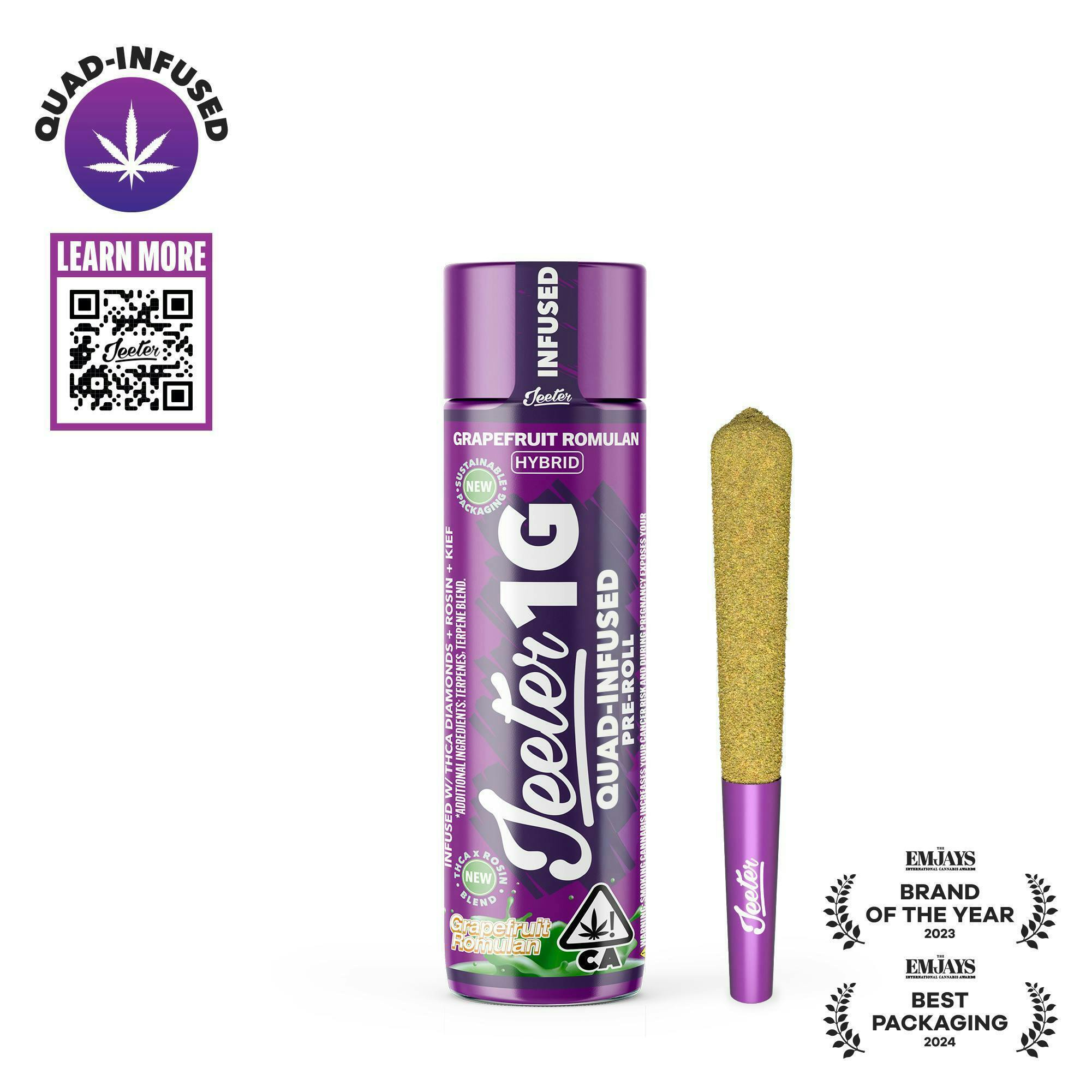 Grapefruit Romulan - HybridGrapefruit Romulan is a descendant of the popular strains Romulan and Grapefruit. This strain, not surprisingly, has a strong grapefruit aroma and flavor. The high is calming and focused, with a mood boost, increased sociability, and physical relaxation.Effects: Relaxed, Happy, FocusedJeeter’s Quad Infused Prerolls combine four layers working in sync for a maxed out infused experience. THCA diamonds add potency, rosin brings smooth, full spectrum depth, expertly crafted terpene profiles help shape the entourage effect while enhancing aroma, and a kief finish adds strength with a hand crafted touch. The result is a harder hitting experience with richer flavor that lasts longer.* Infused w/ THCA diamonds and rosin, dusted in kief* 1g Quad-Infused Joint
