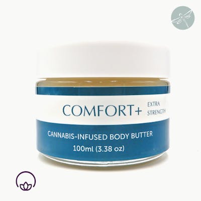 14:1 THC/CBD 100ml (3.4oz) 852.53mg THC, 60.90mg CBD ABOUT: For those with chronic conditions that need extra pain management, we’ve increased potency by 100% for faster-acting, superior relief. Comfort +™ is carefully crafted with a whole plant hybrid of terpene-rich ice-water hash cannabis using a synergistic 14:1 ration of THC to CBD that provides powerful pain relief with a proprietary blend of essential oils great for reducing pain and inflammation. EFFECT: Completely non-psychoactive (because the cannabinoids do not enter the bloodstream), our THC-rich body butters are crafted with care to deeply sooth and nourish your skin, including aloe vera, organic coconut, shea, cocoa butter. Typically provides relief within 5 minutes. Effects last for hours or days. Reapply as needed for pain. Comfort +™ won’t get you high but it can restore balance to painful conditions within minutes. INGREDIENTS: Aloe vera juice, organic shea butter, organic coconut oil, ceterayl alcohol and cetearyl glucose (ECOSERT preservative), cocoa butter, kokum butter, therapeutic grade essential oils (cinnamon, sweet orange, camphor, frankincense and clove), candelilia wax, MCT oil, cannabis, sunflower lecithin, benyzl alcohol, sodium benzoate, potassium sorbate (ECOSERT), xanthan gum