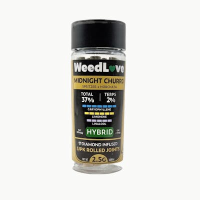 WeedLove to take you way higher with Midnight Churro, a perfectly balanced Hybrid born from Spritzer and Horchata. This flavorful strain delivers a deliciously sweet and spicy profile, blending notes of cinnamon sugar, creamy vanilla, and a hint of fruity zest. Kicked up a notch with crushed diamonds, Midnight Churro releases a rich aroma of baked goods with a subtle gassy kick. The effects strike the ideal balance - starting with an uplifting cerebral buzz before settling into a smooth, relaxing body high.