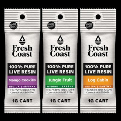 Fresh Coast’s Live Resin Cartridges utilize single-source cannabis-derived terpenes with no cutting agents to provide the highest quality cartridges available on the market. As a result, Fresh Coast carts taste just as amazing as the live resins that inspire them and are derived from the same single source flowers. The high is equal parts physical and mental, with a pleasant, lazy body buzz and sleepiness countered by cerebral effects that include euphoria and a peppy mood boost. This strain is an effective tool in treating low mood, anxiety, nausea, chronic pain, insomnia, and stress. It's also a good choice for alleviating eating disorders and wasting conditions, as it induces a powerful case of the munchies. --------------------------------------------------------------------------------------------------------------------------- —- About The Brand —- Fresh Coast started when a few friends from Northern Michigan with deep ties to the land and cannabis community came together to craft concentrates that are rich in flavor and experience. Drawing upon their heritage, education and training, they took a viticultural approach to the process, creating concentrates that are representative of the harvest and are the truest expression of the plant’s native terpene profile. What started as an effort to craft simple, flower-forward concentrates has developed into a grassroots collective of cultivators, working with top industry artisans at one of Michigan’s leading hydrocarbon extraction facilities. We’re all makers at heart, working to make accessible products for everyone in the state of Michigan, while also doing some good in our community. Inspired by our heritage, we take a viticultural approach to cannabis with a simple philosophy: craft concentrates representative of the harvest. We craft our products to be flower-forward and have the truest expression of the harvest’s native terpene profile. We’re makers at heart, crafting high quality, flavorful concentrates that are accessible to everyone. Fresh Coast works with a variety of cultivars including Michigrown, Hypha, Doghouse, High Level Health, and Glacier. They have multiple lines of cartridges which include their Splash (Live Resin, Distillate mix), 100% Live Resin, and 100% Live Rosin cartridges. They also produce a wide variety of different consistencies of concentrates as well.