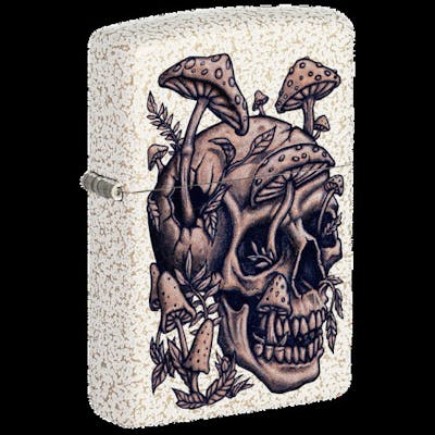Eternal symbols for rebirth and longevity stay fresh and vivid on this Mercury Glass lighter. The intricate skull and mushroom design is achieved with our Color Image process. Comes packaged in a gift box. For optimal performance, fill with Zippo lighter fuel. Genuine Zippo windproof lighter with distinctive Zippo "click" All metal construction; windproof design works virtually anywhere Refillable for a lifetime of use; for optimum performance, we recommend genuine Zippo fuel, flints, and wicks Made in USA; Lifetime guarantee that "it works or we fix it free™" Fuel: Zippo lighter fuel (sold separately) Lighter Specs: Height: 2.25? Width: 0.5? Depth: 1.5? Weight: 2.0 oz.