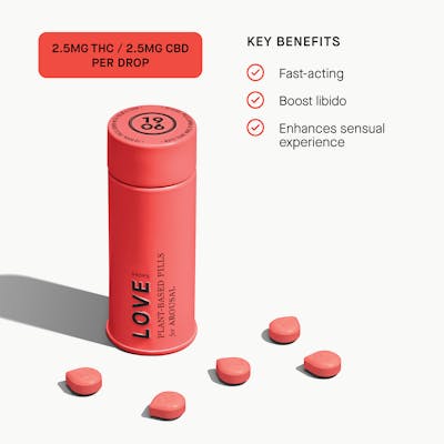 Love boosts arousal through a blend of cannabis and five herbal aphrodisiacs. Swallowable pills with rapid onset of 20 minutes. Vegan, calorie-free, sugar-free, and gluten-free. Every 1906 product activates within 20 minutes using a patented technology that makes them the fastest-acting edibles in the world. Get next-level happy with this euphoric blend of a single strain of cannabis sativa, Kanna and three other mood enhancing plant medicines. Thoughtfully engineered to give you a deep sense of wellbeing and extroverted social energy. All 1906 Drops are calorie-free, gluten-free, and vegan. Drops are made for swallowing; PLEASE DO NOT CHEW! "We started 1906 because we believe cannabis is the greatest medicine on earth. Our goal is to make cannabis a trusted, normal part of daily wellness with products that are easy to understand and easy to fit into your life and offer the most healthful format of cannabis available. 1906 is named for the last time cannabis was widely accepted as a beneficial medicine. The Wiley Act was enacted the following year, beginning nearly a century of misguided cannabis prohibition with devastating consequences. We say it’s high time to make cannabis accessible and understandable for all—for the greater good (and the greater fun)."