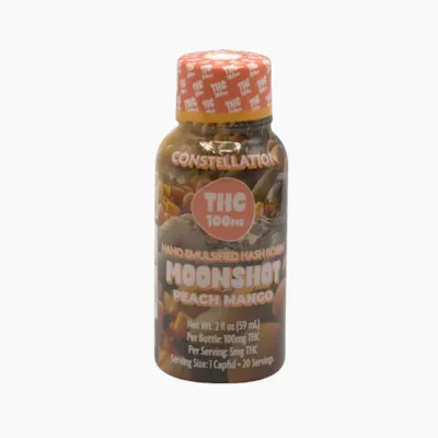 Peach Mango Moonshot is a 100mg hash rosin edible infused with nano-emulsified cannabis for ultra-fast effects, blending juicy peach flavor with sweet tropical mango in a smooth, potent dose.