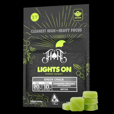 20mg:10mg / THC:THC-V (per piece) The Heavy Hitters Green Crack THCV Gummy is designed to be a lean, mean, green machine, ready to get you high and hyped, without the hunger. Green Crack, also known as “Green Crush”, is a potent, uplifting super-sativa, descended from the storied Skunk #1 strain, and a still unknown landrace indica. With a kiwi and melon forward flavor, and amped with a bold 2:1 ratio of THC and energizing THCv, these gummies pack 30mg of total cannabinoids per piece, enough to get you flying high and ready to seize the day, minus the munchies. Gluten Free | Dairy Free | Nut Free Strain Type: Sativa Taste Profile: A delicious blend of kiwi, melon, and subtle hits of sour apple Effect Profile: Uplifting, Happy, Focused Terpene Blend: Limonene, Myrcene, Caryophyllene