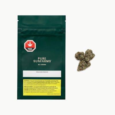 Pure Sunfarms cut of Pink Kush from BC's Vancouver Island is a coastal relative of the legendary OG Kush. This special strain is beloved across Canada for its strong aromas, colourful flowers, and high THC potential. Beneath a thick coating of trichomes, the dense and round buds feature forest green leaves, often with a purple hue, mixed with dark amber pistils. Grown in a high-tech greenhouse in the Fraser Valley, each bud is carefully trimmed and hand-groomed, dried and cured to precise standards. Pink Kush showcases gassy aromas of white pepper, orange, butterscotch, coffee, earth, and grapefruit, the result of a rich combination of terpenes that includes caryophyllene, myrcene, humulene, bisabolol, and limonene.