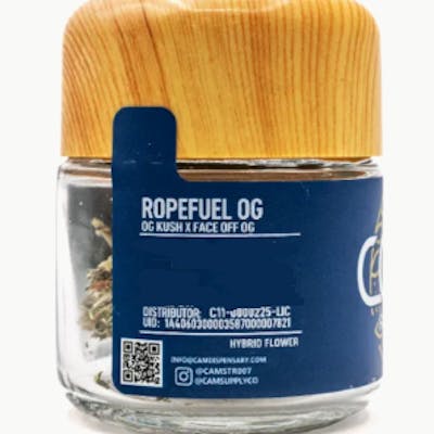 Ropefuel OG is a cross of OG Kush x Face Off OG. This indica-dominant hybrid brings together a bold fuel-like aroma with a smooth, relaxing high that makes it a perfect choice for unwinding after a busy day or chilling with friends. The buds are dense and frosty, bursting with rich, gassy terpenes and earthy notes, with hints of pine, citrus, and a touch of skunk that give this strain its signature, powerful fragrance. The flavor is just as bold, with that signature diesel taste that’s balanced by subtle sweetness and herbal complexity. As for the effects, Ropefuel OG offers a heavy-hitting body high that’ll have you feeling relaxed and deeply mellow. This strain is perfect for those looking to decompress, combat stress, or just enjoy a relaxing evening at home. The high starts with an uplifting head rush that quickly melts into a calm, sedative body buzz, helping you feel grounded and at ease. Ropefuel OG is ideal for those seeking relief from pain, insomnia, or anxiety, thanks to its powerful relaxing properties