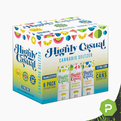 6pack of 5mg Cans 1:1 THC:CBD We’re excited to bring you the next best thing in weed (and seltzer too, why not). Highly Casual is the super sippable infused seltzer that you've been waiting for. Available in variety 6-pack for the first time ever complete with three delicious flavors: 2x Lemon Lime 2x Strawberry Watermelon 2x Blueberry Pineapple