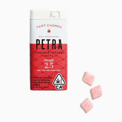 The Tart Cherry Sugar-Free Mints 40-Pack (100mg) by Petra (a celebrated brand by Kiva Confections) is a "precision-engineered and micro-dose" staple designed for those who seek a controlled, functional high with maximum discretion. This portable tin contains 40 "poppable" mints, each featuring a gentle 2.5mg of THC (100mg total per pack), utilizing a sugar-free, vegan formulation sweetened with plant-derived xylitol and stevia for a "clean and guilt-free" experience. It delivers a "robust and mouth-watering" aromatic profile defined by the zing of a ripe, tart cherry picked straight from the tree, artfully masking any cannabis notes with natural fruit juices and malic acid for a crisp, refreshing finish. Its effects are prized for being "mentally clarifying and subtly relaxing," providing a soft, manageable glow that helps take the edge off social anxiety or daily stress without overwhelming the senses, making it a premier choice for "micro-dosing throughout the workday," creative focus, or finding a centered headspace while maintaining an active lifestyle. With Kiva’s commitment to "gold-standard testing and artisanal integrity," the Tart Cherry Petra Mints offer a sophisticated and reliable way to achieve a "steady, high-altitude mindset" one tiny, flavorful step at a time.