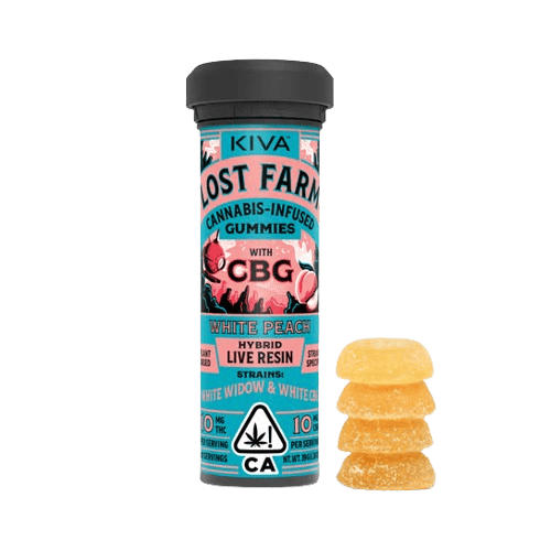 The White Peach x White Widow x White CBG 10:10 Live Resin Gummies (10-Pack) by Lost Farm (by Kiva) is a "precision-engineered and mentally illuminating" cannabis confection designed for those who seek a balanced, high-fidelity experience that pairs legendary genetics with modern cannabinoid science. This 10-count package features a synergistic 1:1 ratio of THC and CBG, with each gummy delivering 10mg of THC and 10mg of CBG (totaling 100mg of each per pack) infused with 100% strain-specific White Widow and White CBG live resin. By capturing the plant's essence at peak harvest, it delivers a "tart, juicy, and sweet" white peach flavor profile that artfully dances with the woody, herbal, and earthy notes of its parent strains. Its effects are prized for being "vibrantly euphoric and intellectually clear," providing a shimmering, carefree glow that blends White Widow's famous cerebral buzz with CBG's neuroprotective and anti-inflammatory properties, making it a premier choice for "social gatherings," creative brainstorming, or maintaining a "steady, high-altitude mindset" during productive afternoons. With Kiva’s commitment to "plant-based purity and strain-specific exploration," these gummies offer a sophisticated and functional way to achieve a "lucid, sun-drenched headspace" while staying grounded and physically at ease.