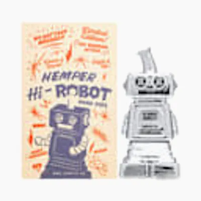 Hemper Hi-Robot novelty glass water pipe featuring a fun robot-inspired design with detailed features and a compact, functional build. Crafted from durable heat-resistant glass, it includes a built-in water chamber and downstem for smooth filtration, delivering cool, clean hits in a unique, collectible piece.