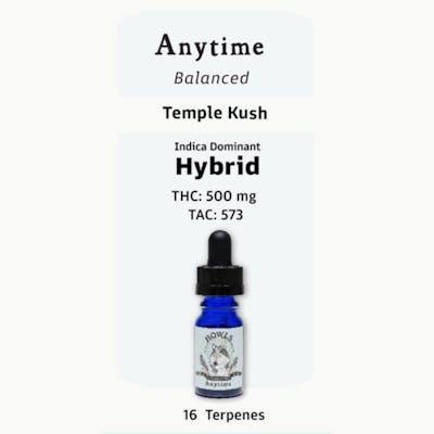 Howl's Anytime Tincture – Strain-Specific, Full-Spectrum Relief Type: Hybrid Strain Used: Temple Kush Cannabinoid Content: 500mg THC per bottle Dosing: 1ml dropper = 50mg THC | 0.1ml = 5mg THC Best For: Managing daily stress, enhancing focus, promoting calm without sedation Usage: Sublingual (under the tongue) or mixed into food and drink